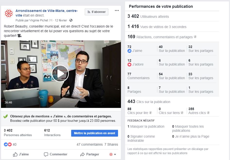 L’initiative est un succès : pendant un peu plus de 40 minutes, M. Beaudry répond à de nombreuses questions citoyennes et les commentaires positifs abondent.