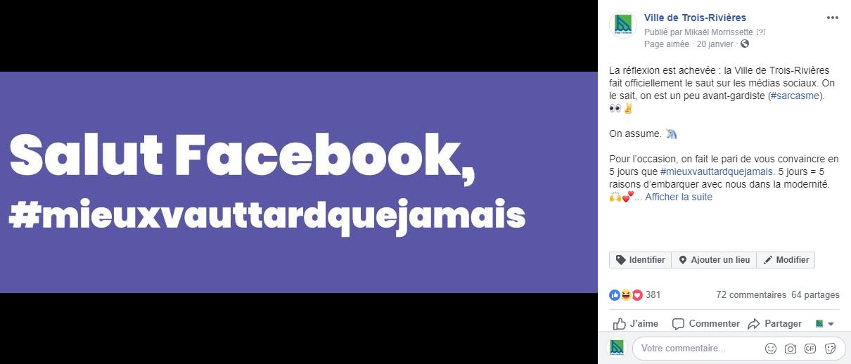 Empreinte de son retard et assumant le caractère peu novateur de sa démarche, la Ville intègre finalement les médias sociaux en janvier 2019 avec une campagne audacieuse et tout en humour signée #mieuxvauttardquejamais.