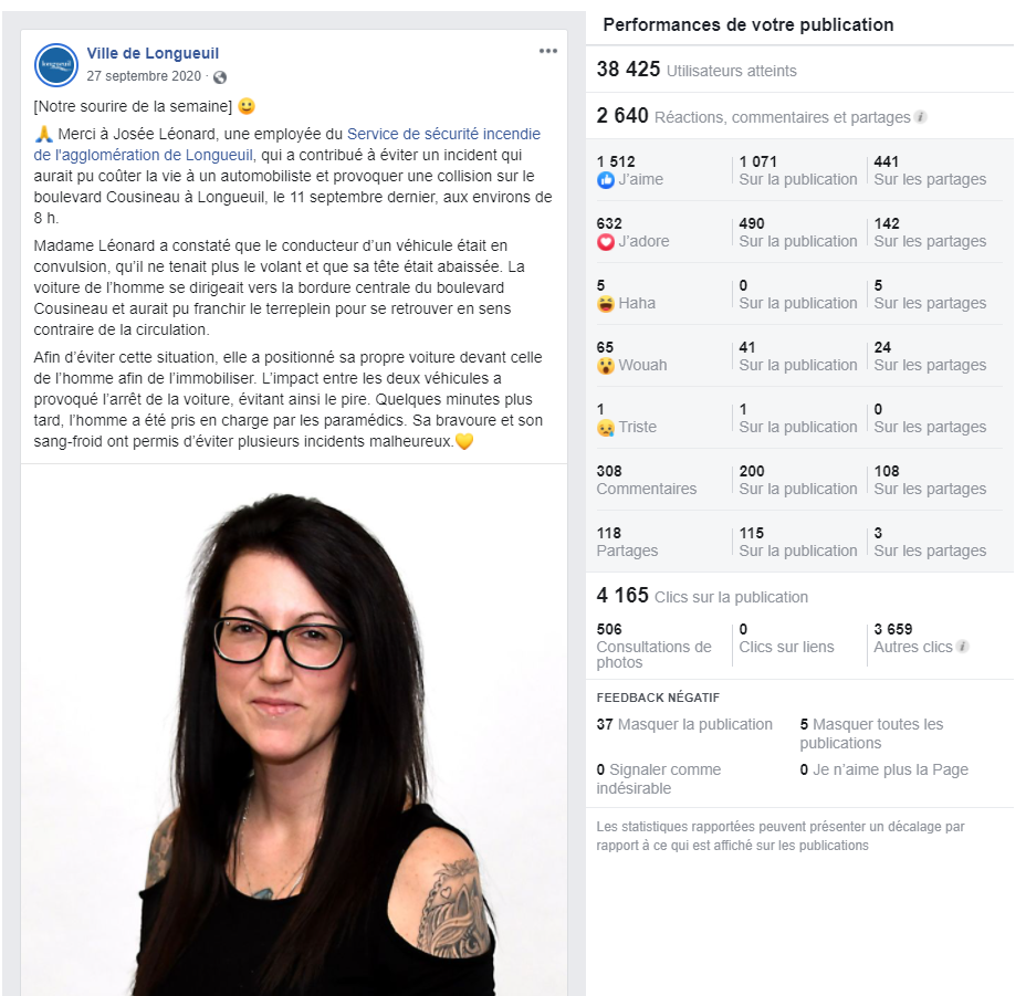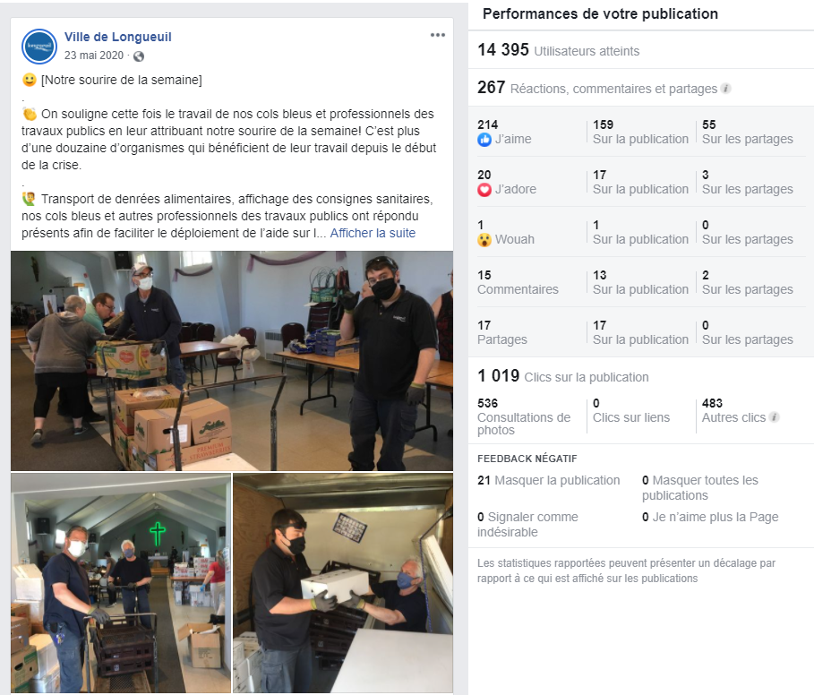 Une campagne à grand déploiement intitulée Notre Sourire de la semaine a permis à la Ville de Longueuil de mettre en lumière sur sa page Facebook des bons coups d’employés et de partenaires qui se sont rapidement adaptés au contexte changeant de la pandémie, et ce, pour le mieux-être des citoyens.