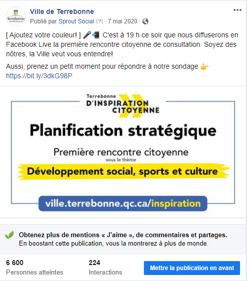 Terrebonne innove dans ses actions communicationnelles menant à la réalisation de son tout premier plan stratégique. Du au contexte, Terrebonne fait preuve d'agilité pour consulter toutes les parties prenantes en revisitant les modes de fonctionnement traditionnels vers des plateformes numériques.