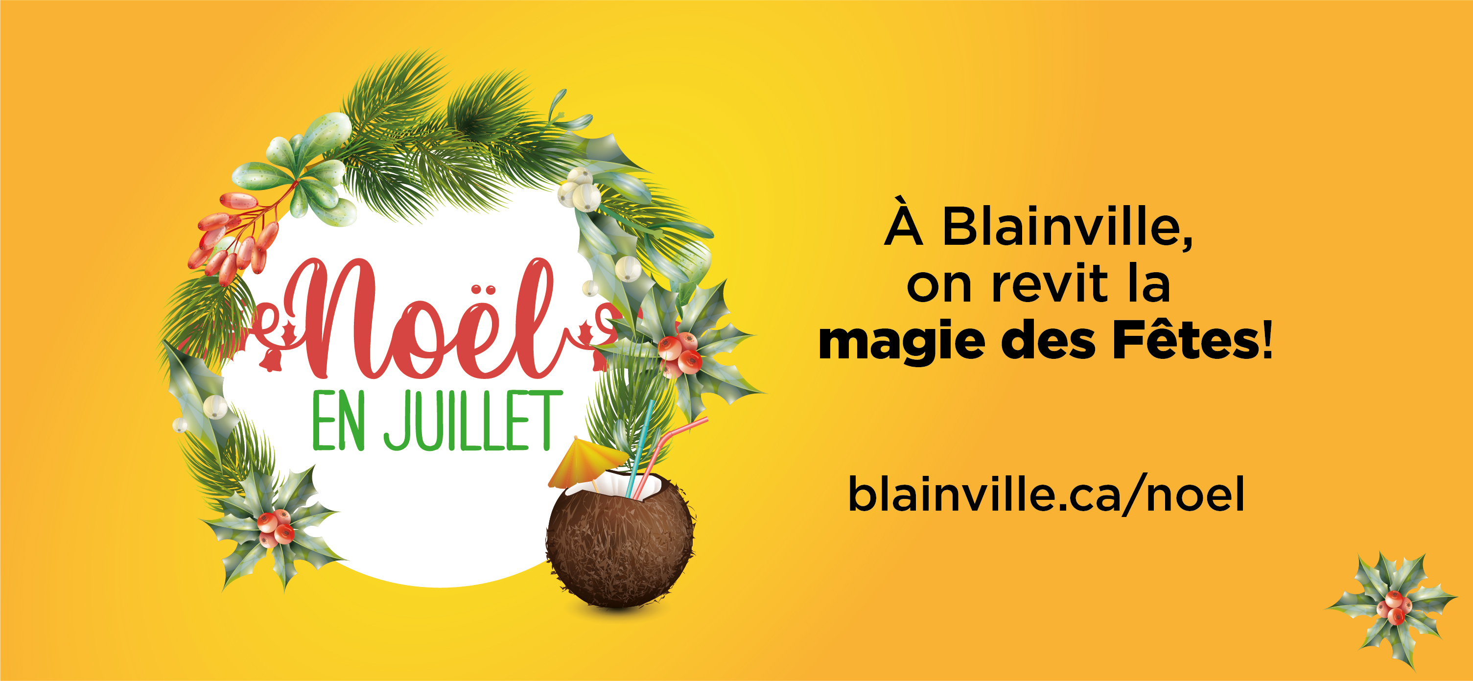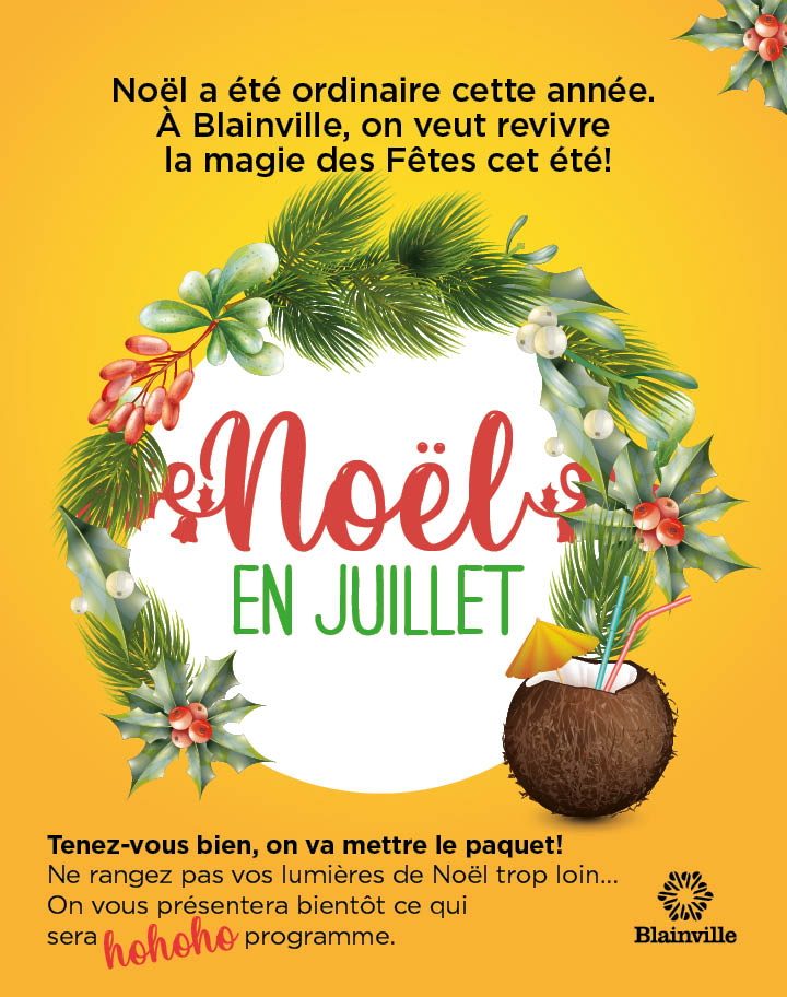 Parce que Noël 2020 a été assez ordinaire dû à la Covid-19, la Ville de Blainville a décidé de faire revivre la magie des Fêtes à ses citoyens…en plein été! Durant tout le mois de juillet 2021, la Ville a été complètement Noël: décorations, espace féérique, visite du père Noël, marché de Noël, etc.!