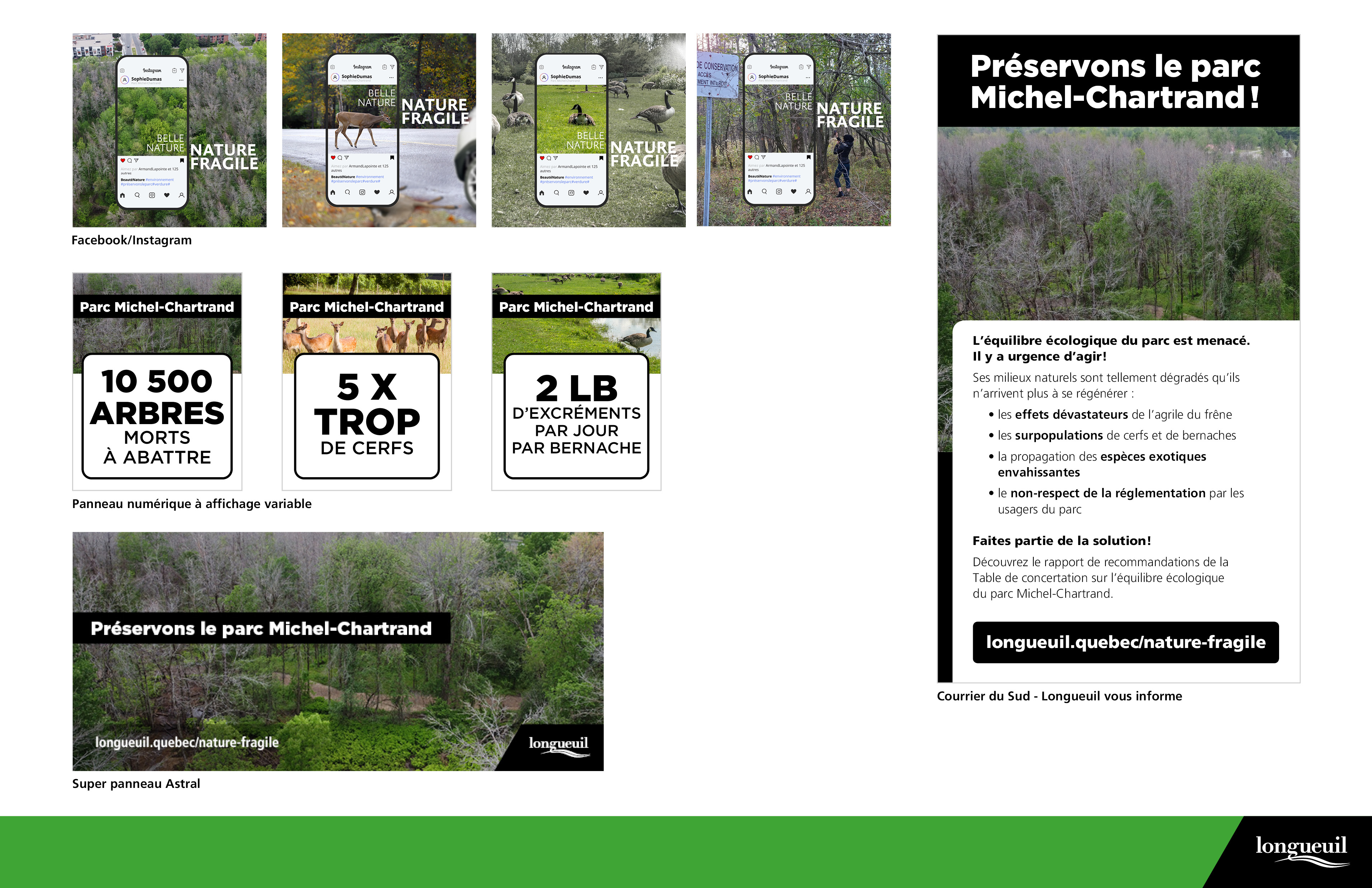 La biodiversité du parc Michel-Chartrand à Longueuil est en péril. Comment l’illustrer? Comment l’expliquer? Par des visuels et des messages choquants qui brisent la fausse image d’un parc en santé et qui présentent une dualité, soit la beauté de ce joyau naturel par opposition à sa fragilité.